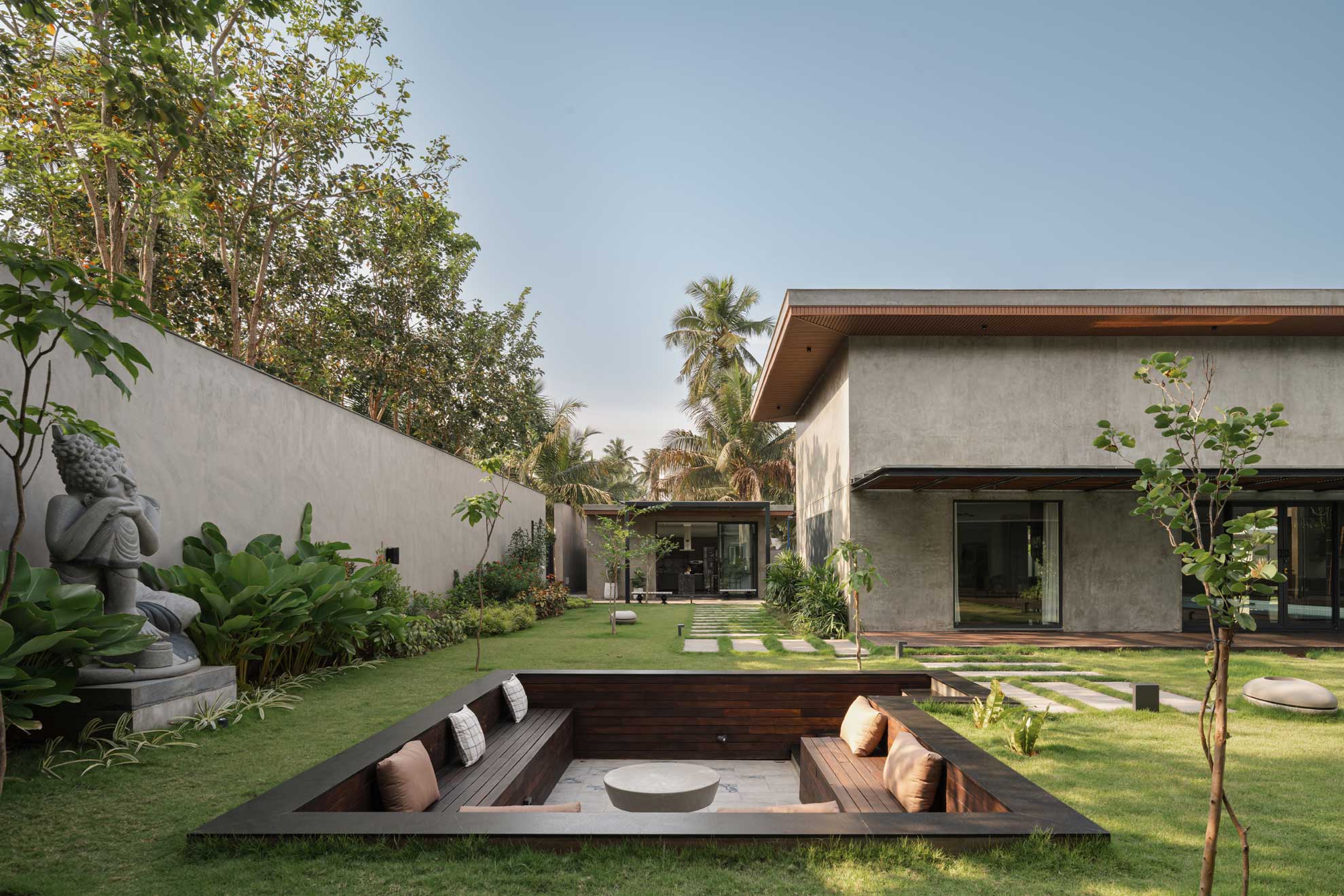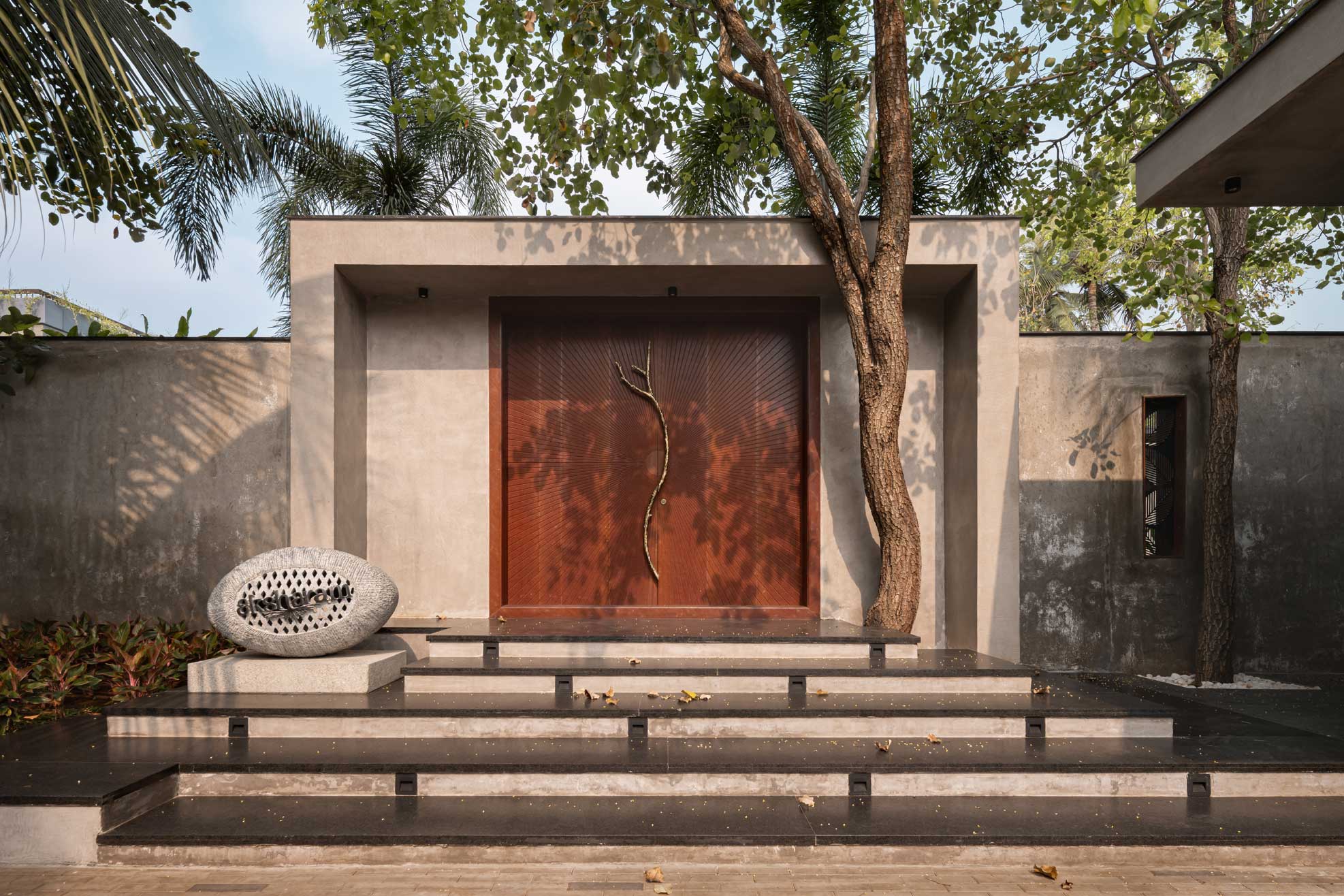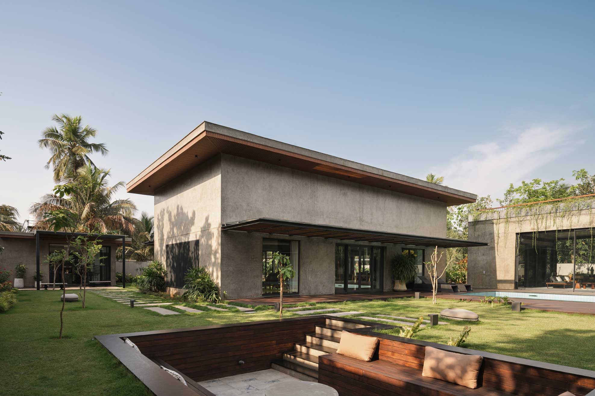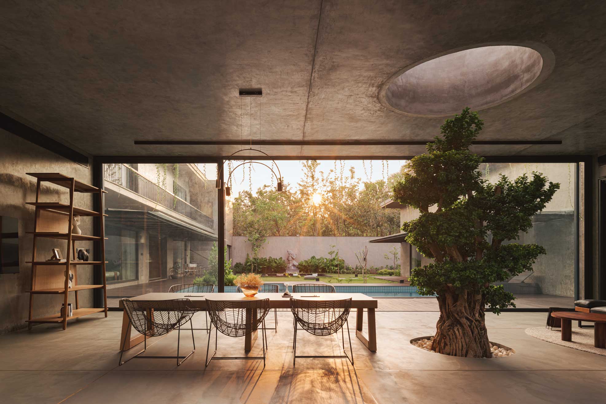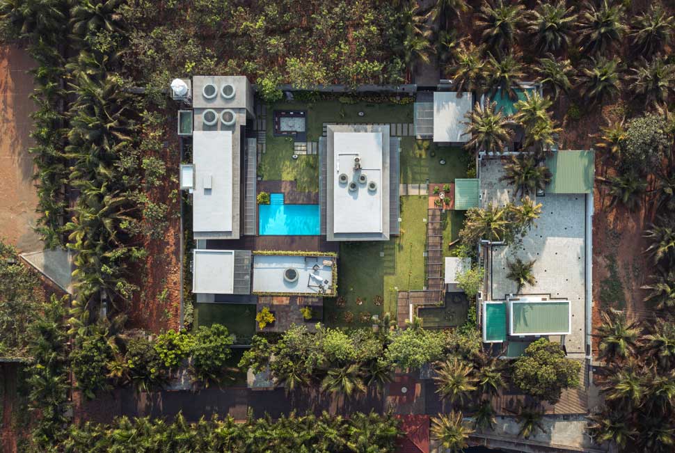 The home is thoughtfully carved out of a 30,000-square-foot parcel within the larger farm, carefully chosen to maximize privacy, natural shading, and connection with the existing topography. Of this, just 8,000 square feet is built-up, reinforcing the idea that architecture here is meant to complement, not compete.
