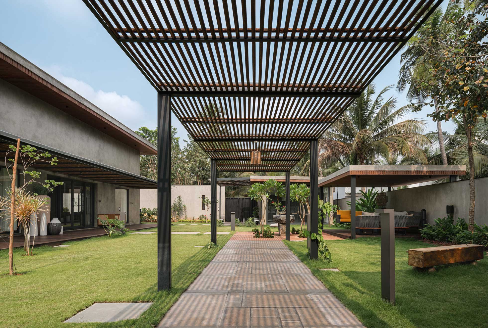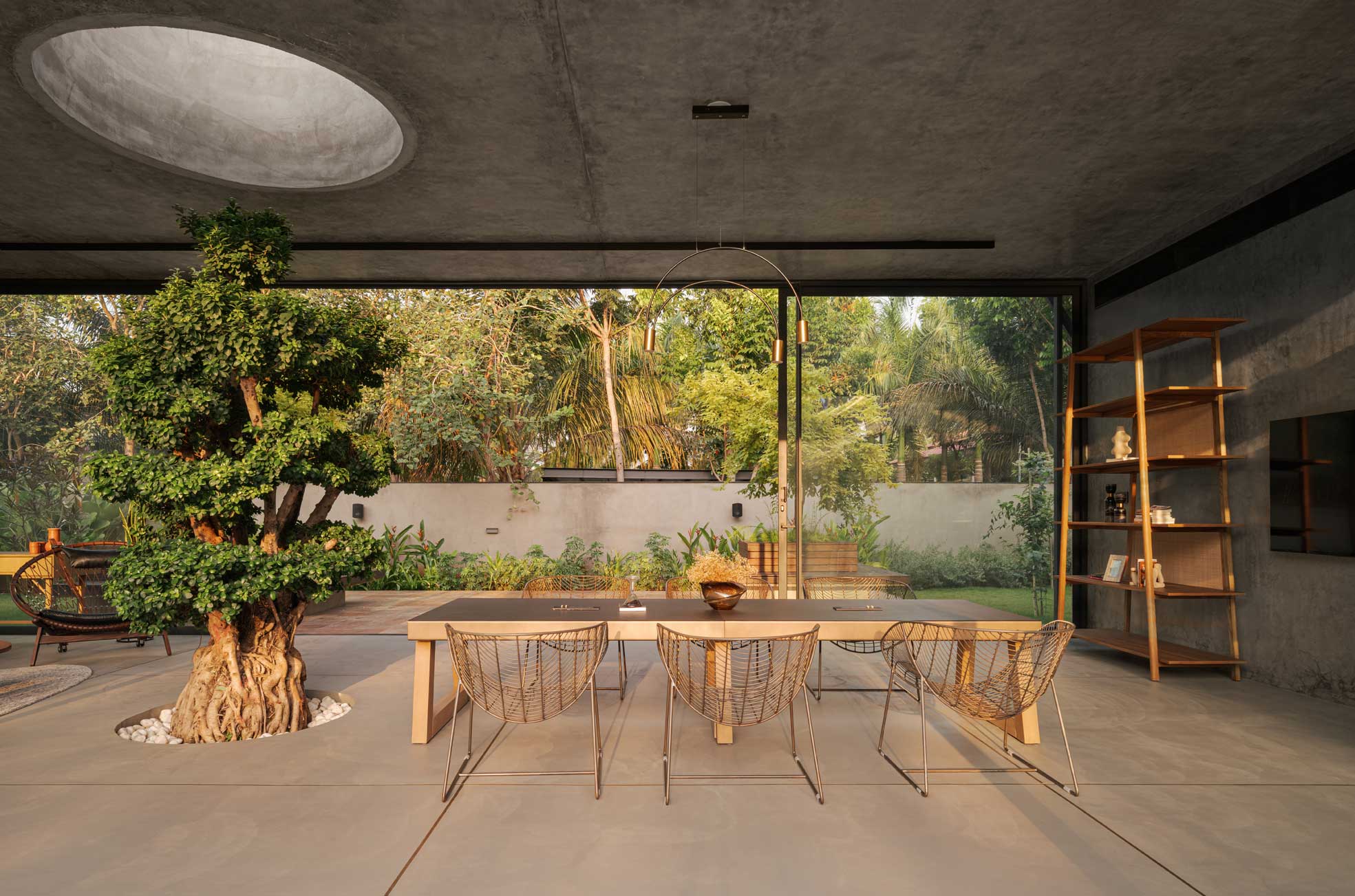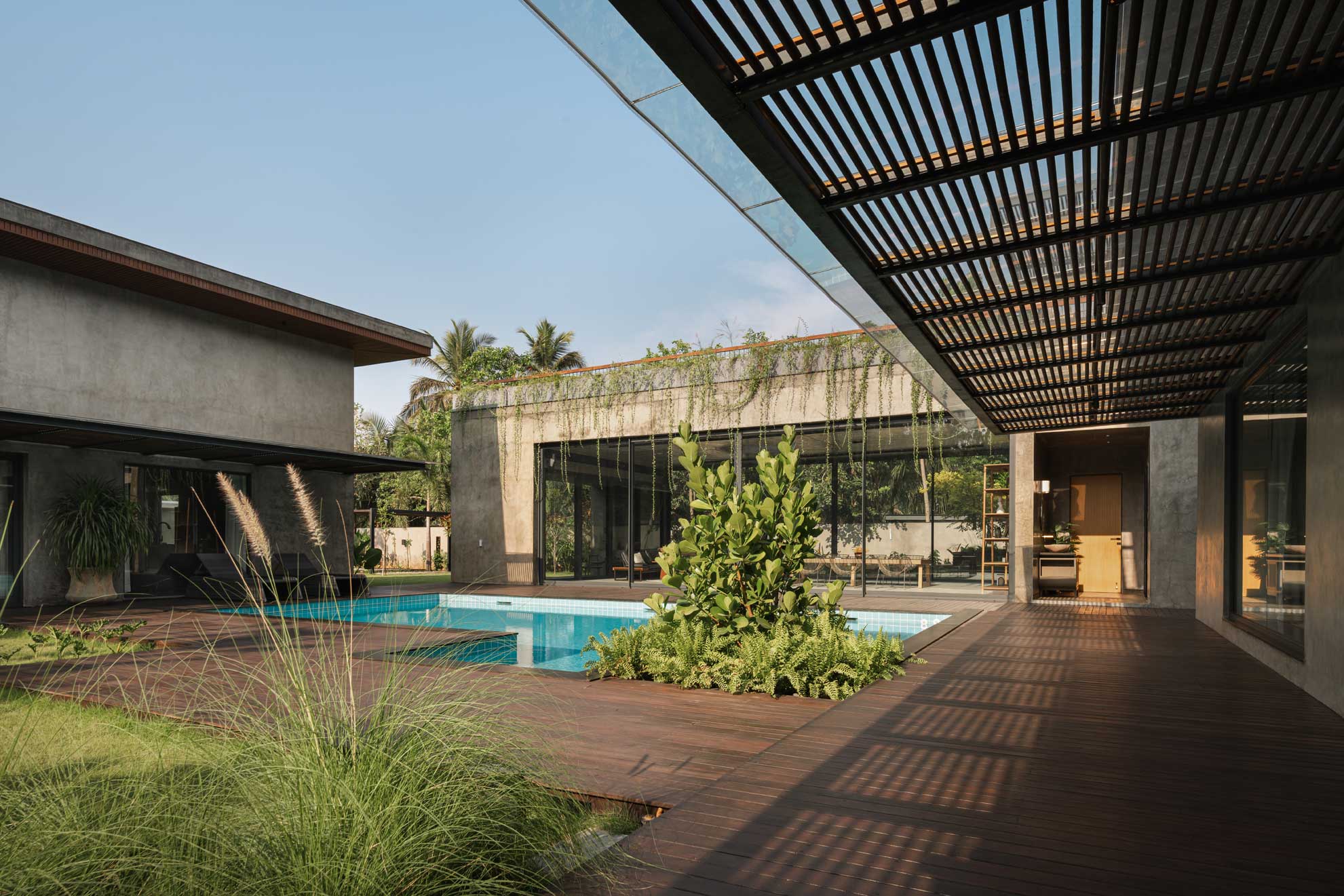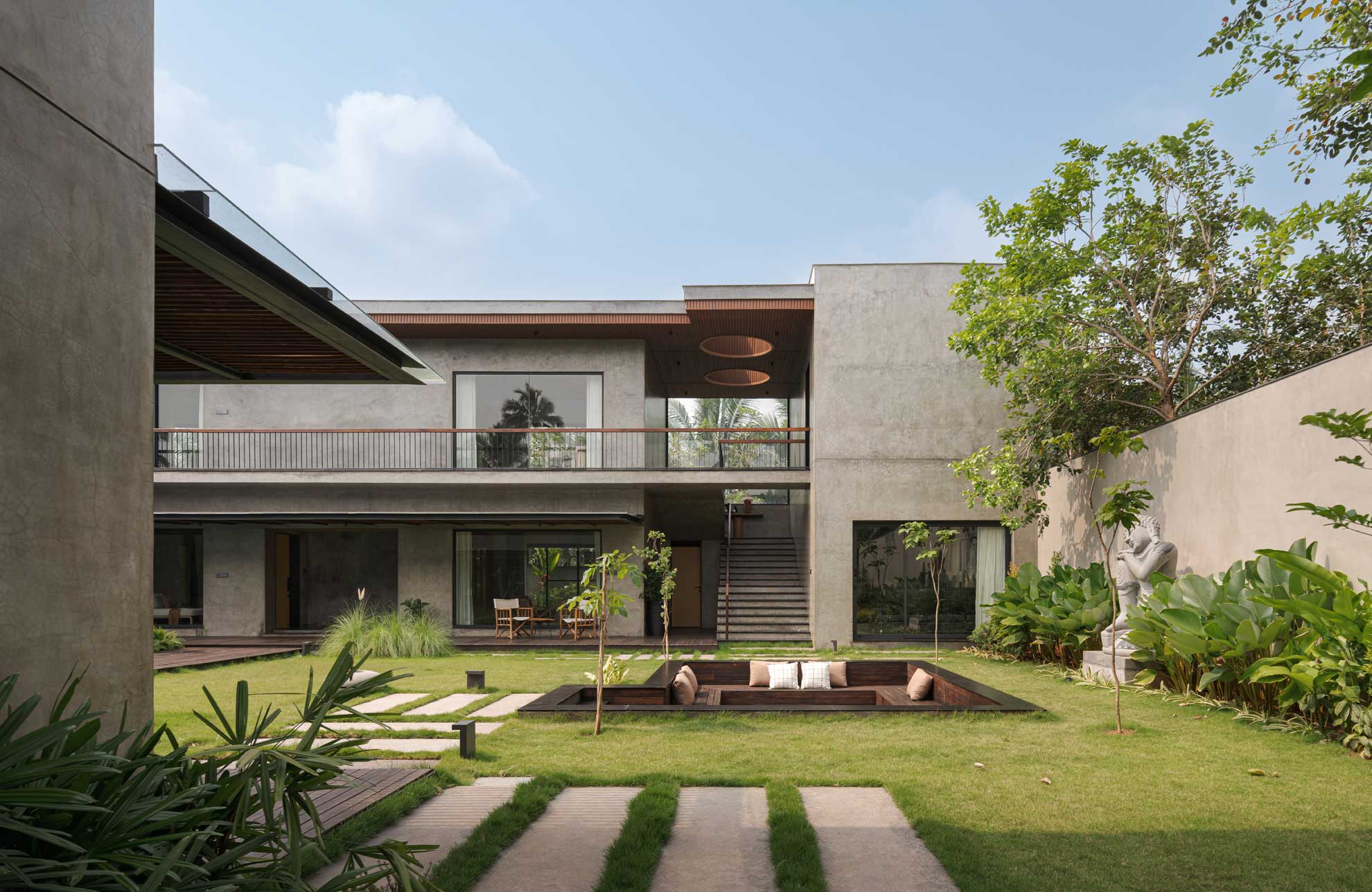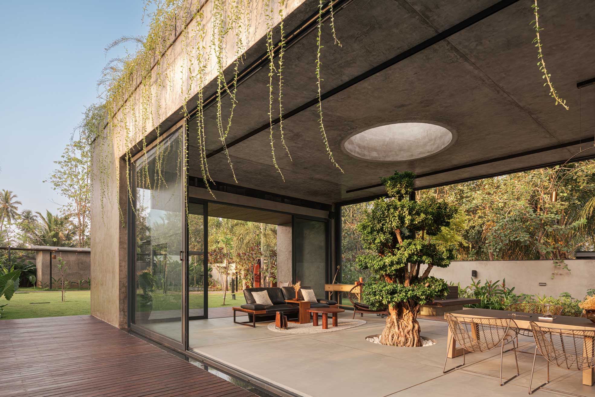 The home is thoughtfully carved out of a 30,000-square-foot parcel within the larger farm, carefully chosen to maximize privacy, natural shading, and connection with the existing topography. Of this, just 8,000 square feet is built-up, reinforcing the idea that architecture here is meant to complement, not compete.