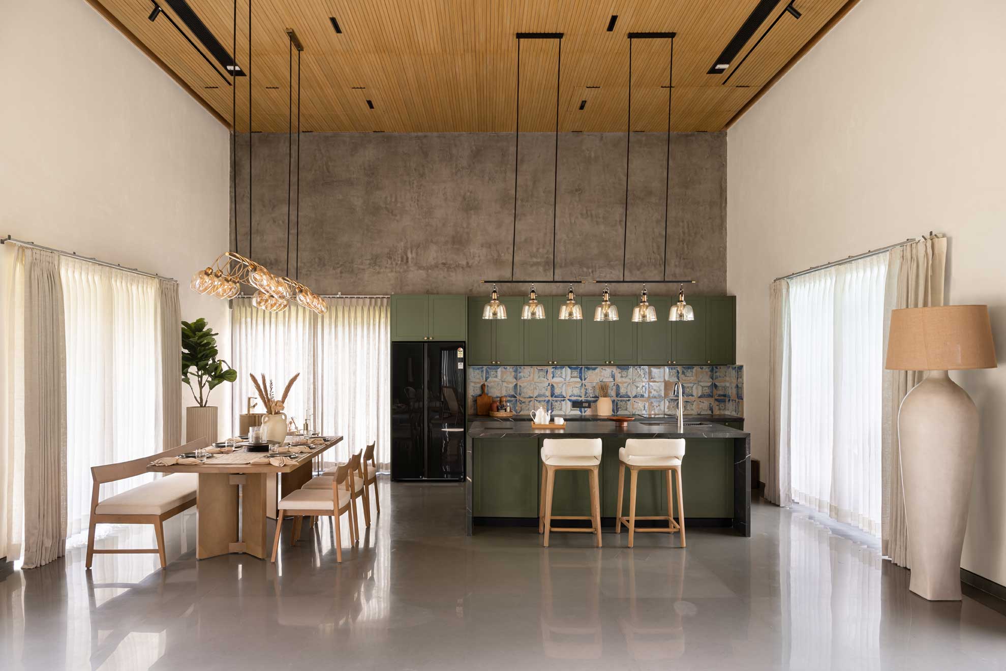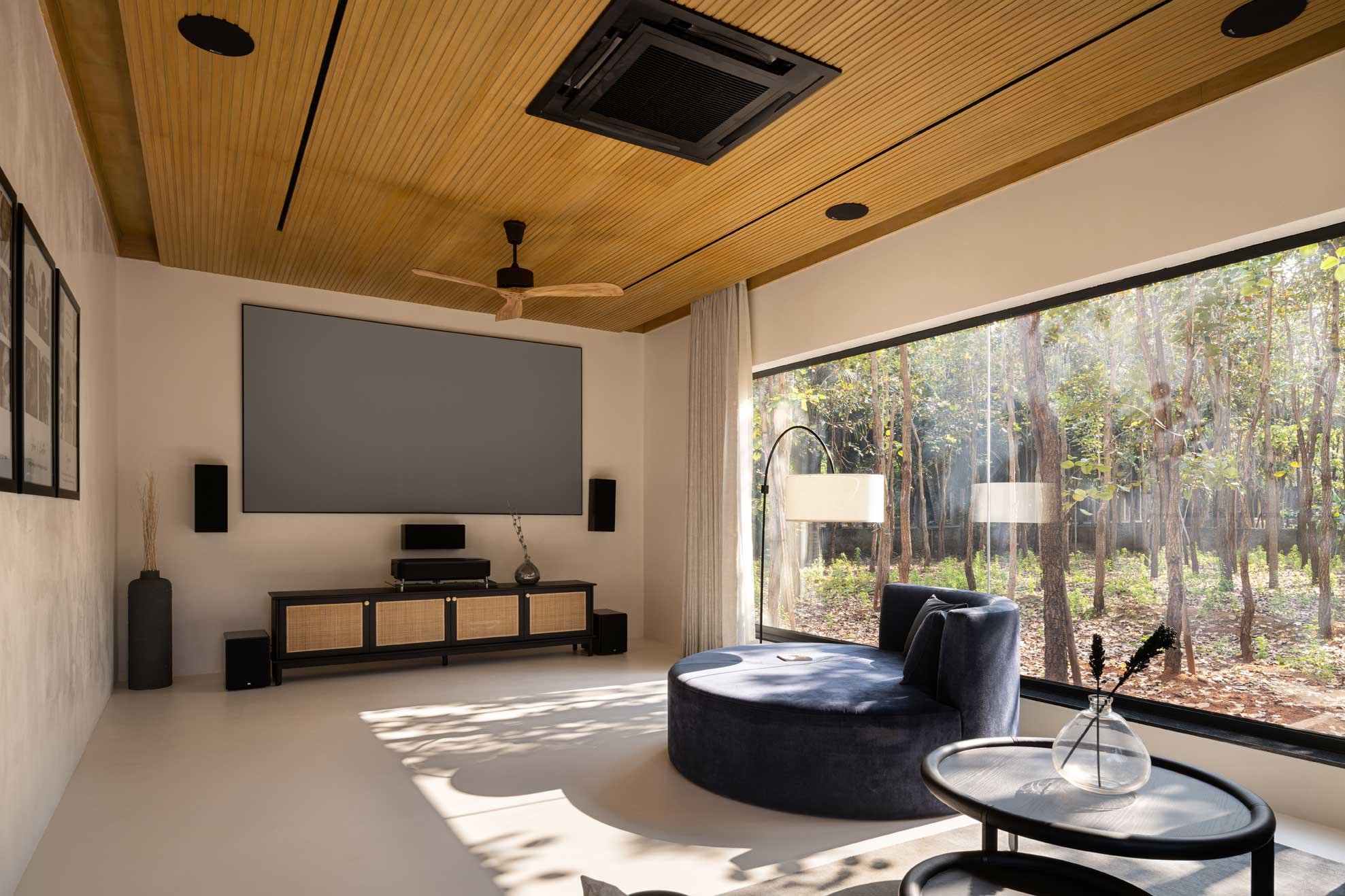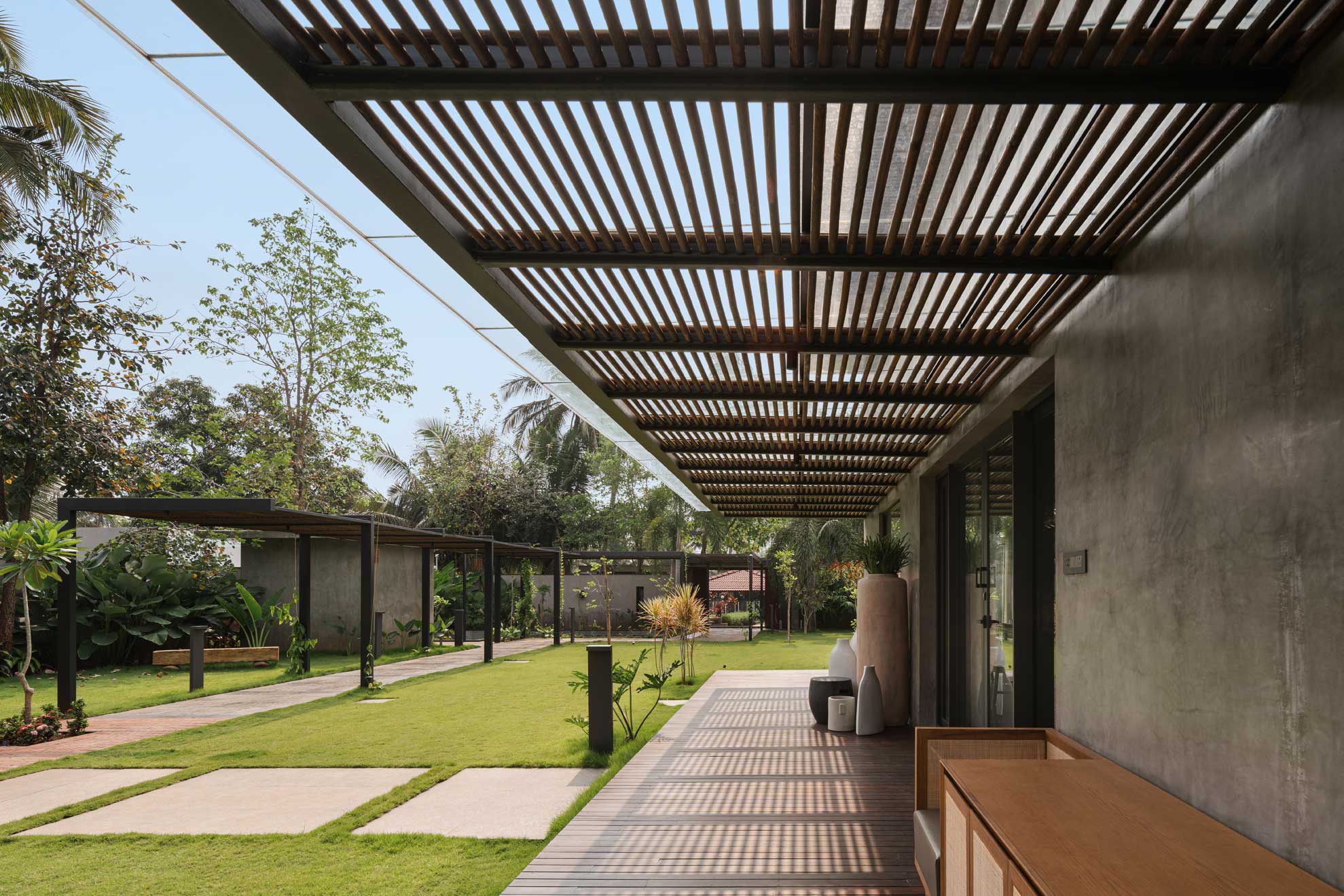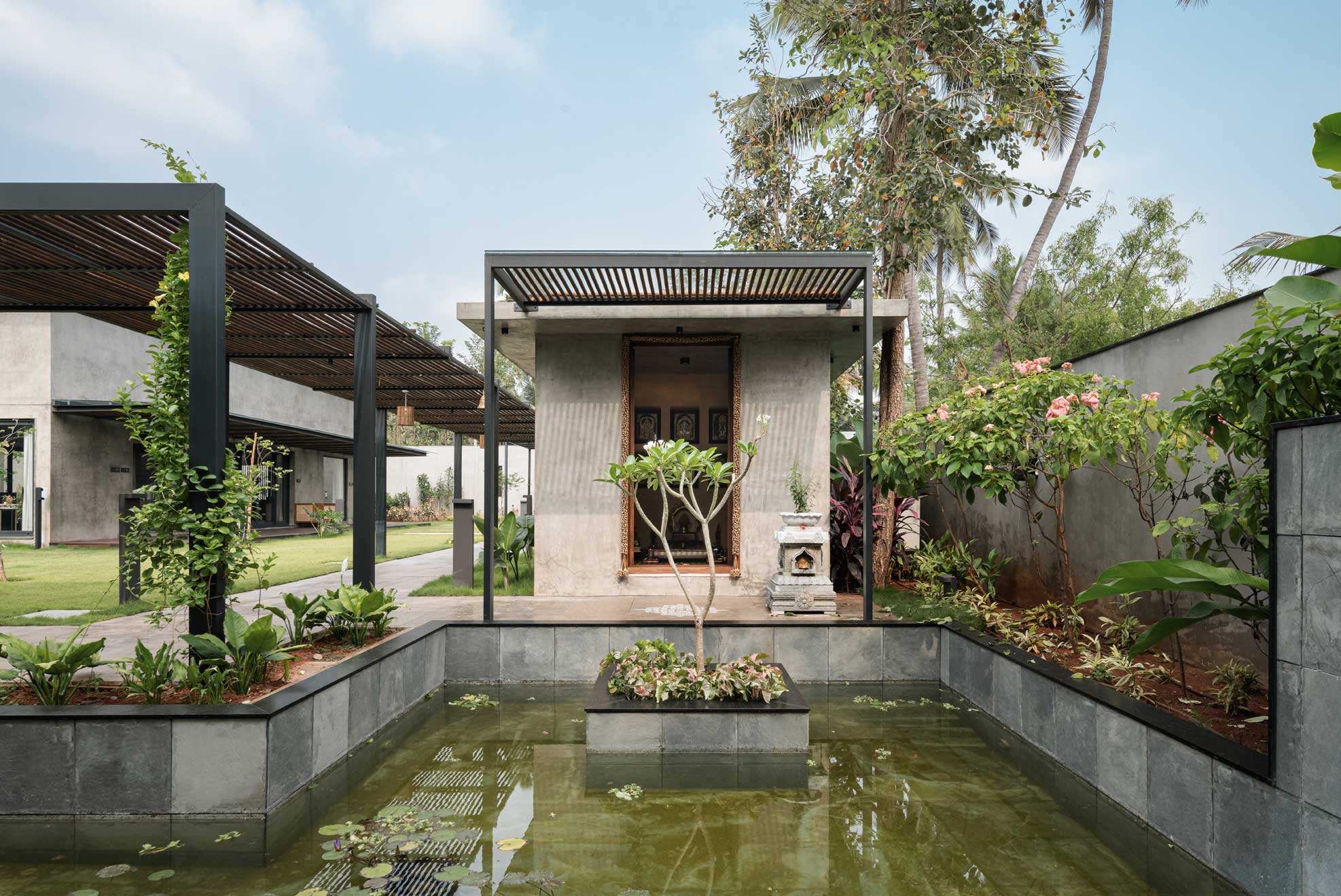 The home is thoughtfully carved out of a 30,000-square-foot parcel within the larger farm, carefully chosen to maximize privacy, natural shading, and connection with the existing topography. Of this, just 8,000 square feet is built-up, reinforcing the idea that architecture here is meant to complement, not compete.